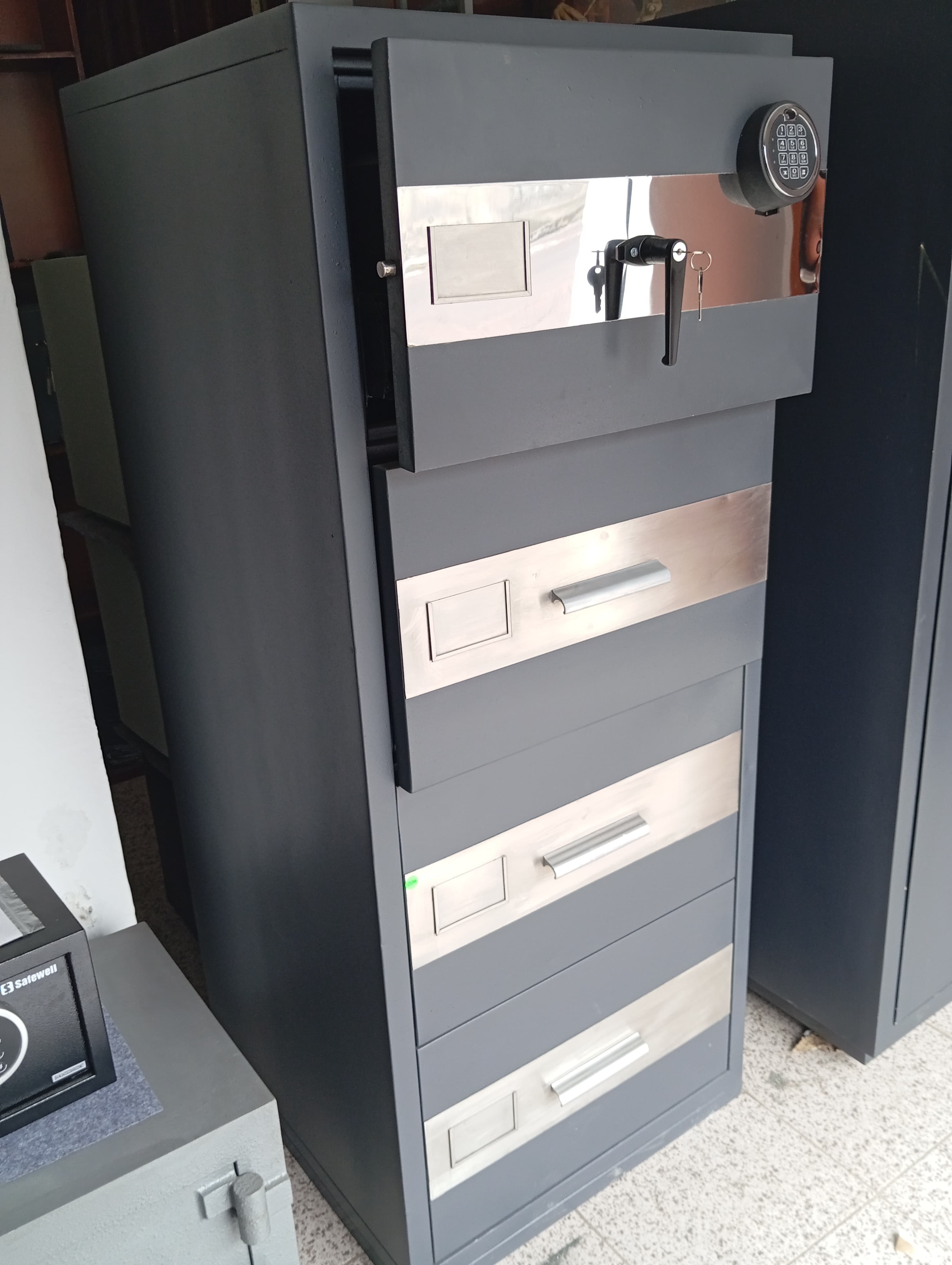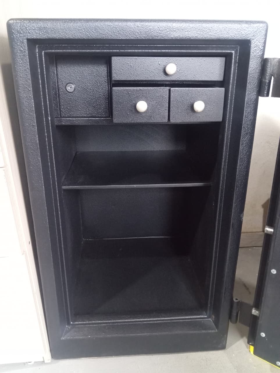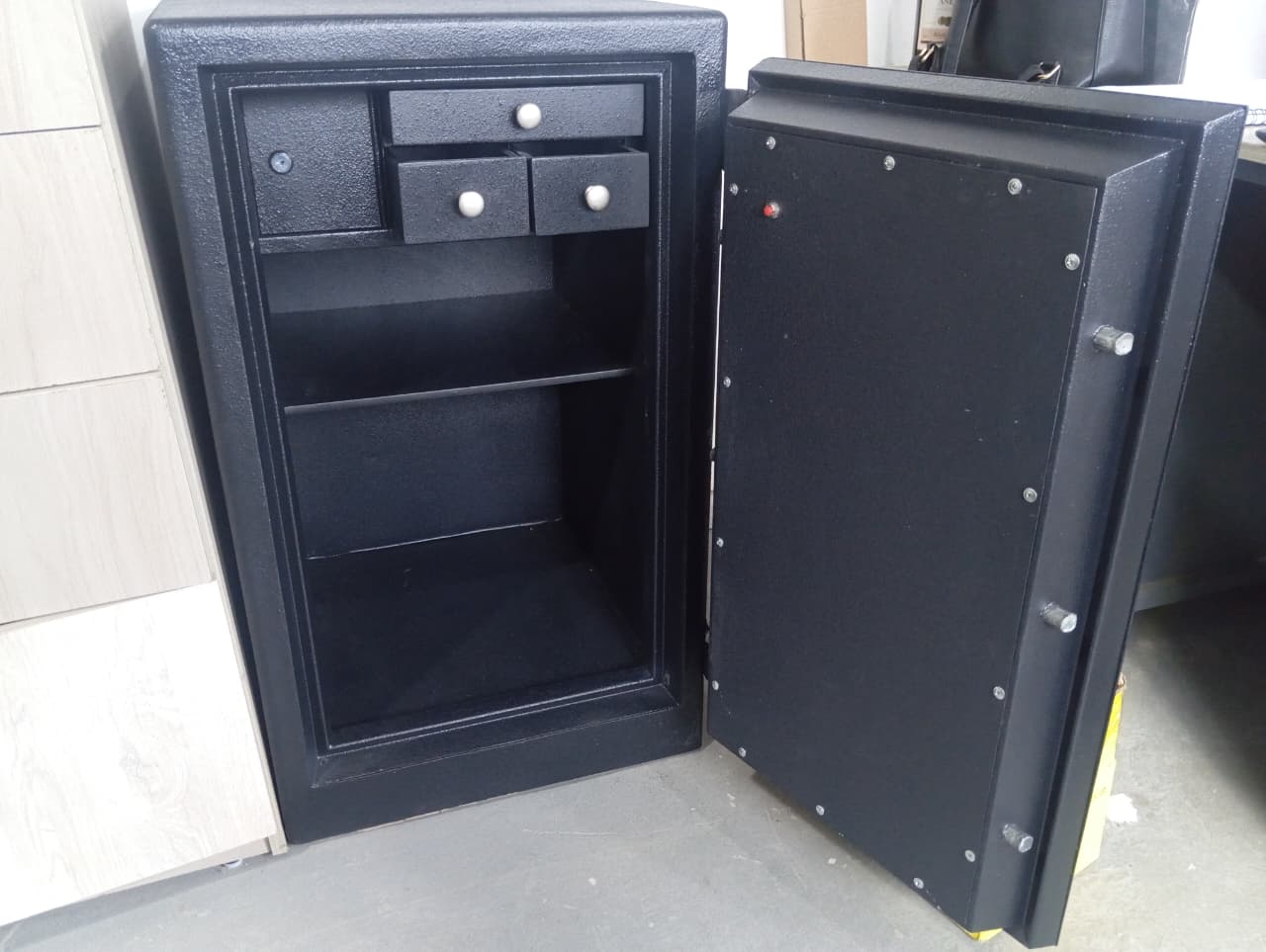 - Caja fuerte de seguridad en medidas 87*51*53cm alto, ancho y fondo respectivamente, cuenta con una división móvil y cuatro gavetas pequeñas.
